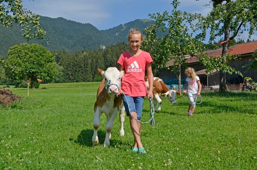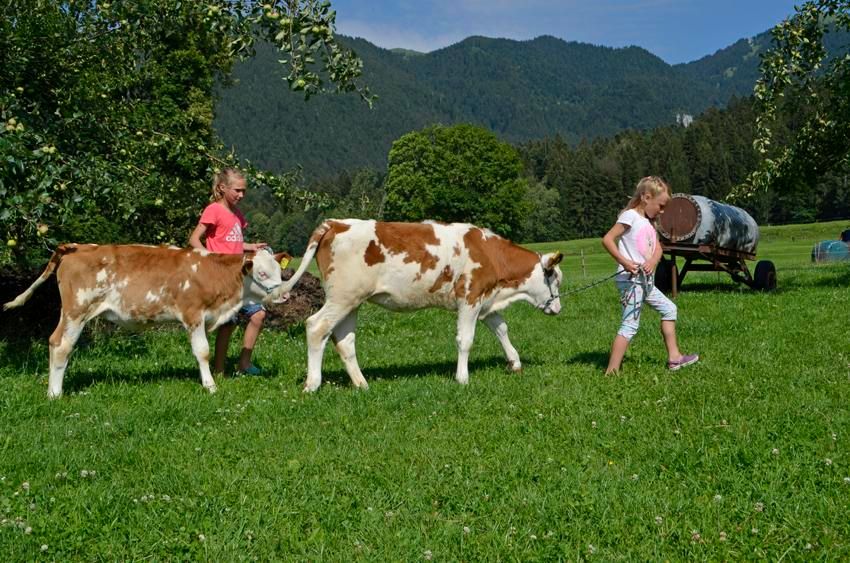 Auf unserem Bauernhof gibt es Milchkühe, Kälber, Hühner, Enten, Hasen und Katzen.