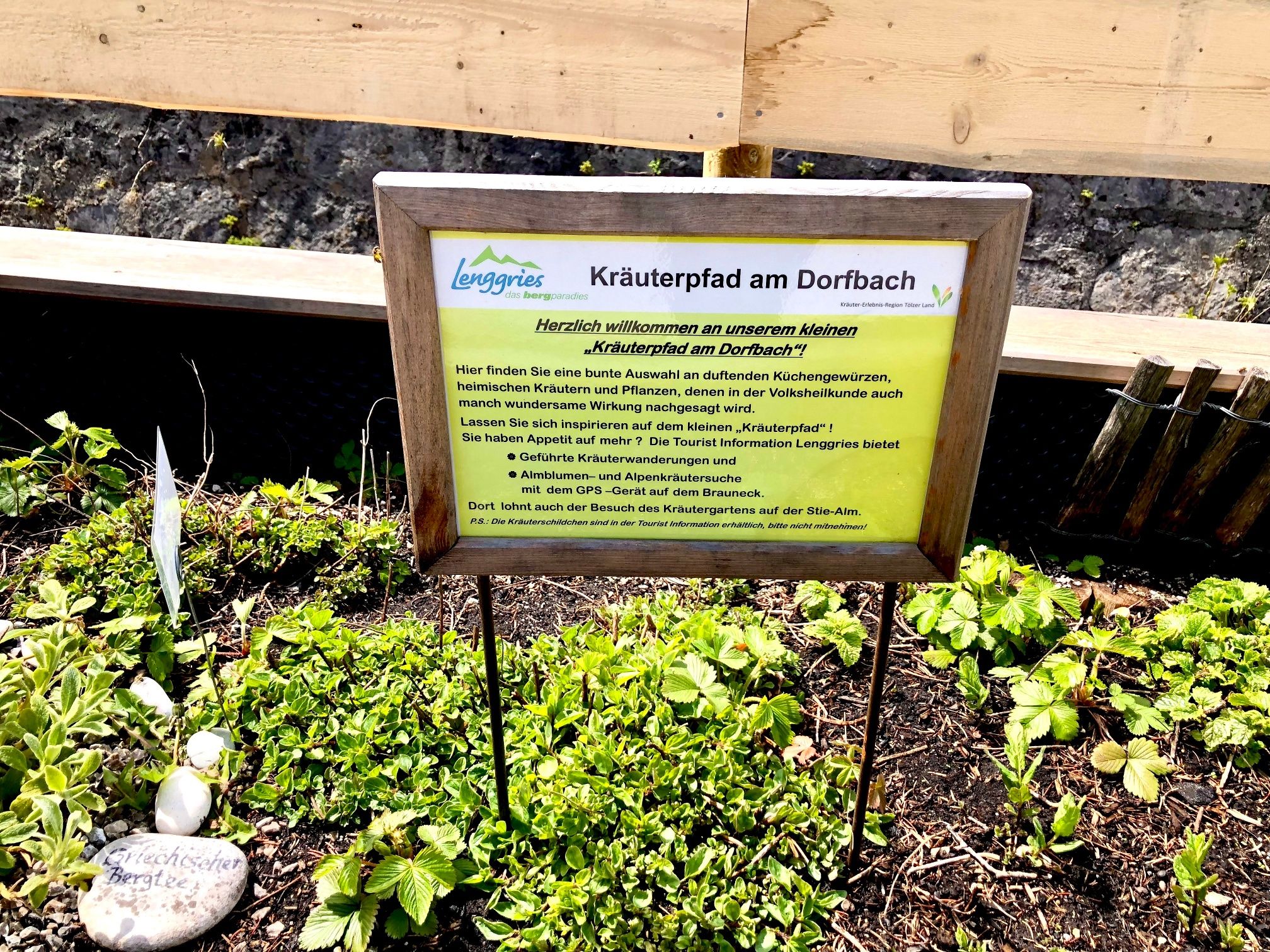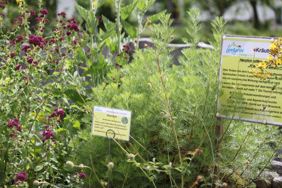 In einer Hochbeetreihe entlang des Lenggrieser Dorfbaches mit Blick auf die Lenggrieser Pfarrkirche St. Jacobus bis hinüber zum Brauneck tummeln sich unterschiedlichste Duft-, Wild- und Heilkräuter. Kleine Schilder erklären dem Besucher mit Kurzbeschreibungen, um welche Kräuter es sich handelt und wie sie verwendet werden können.