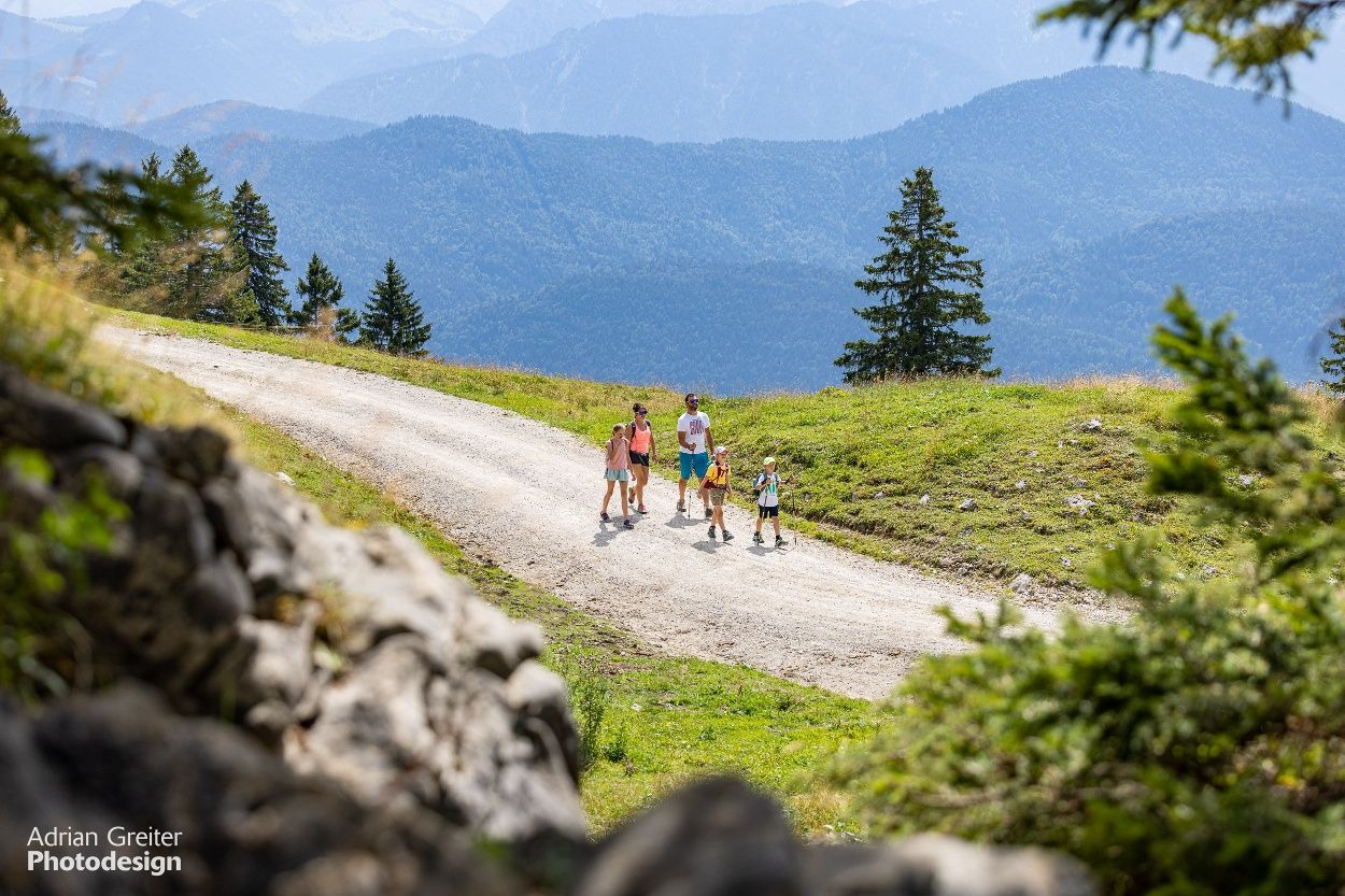 Die Wanderung beginnt an der Bergstation (1500 m) und endet an der Tölzer Hütte (ca. 20 min.). Dieser Schotterweg ist auch mit Kinderwagen befahrbar.